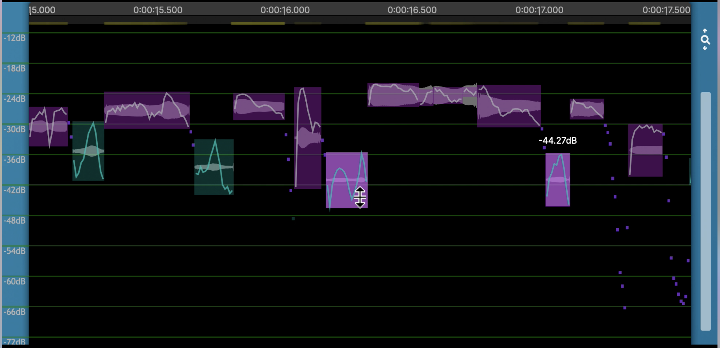 The green blocks at lower levels show where the waveforms are sibilants, breaths, or other noises.
