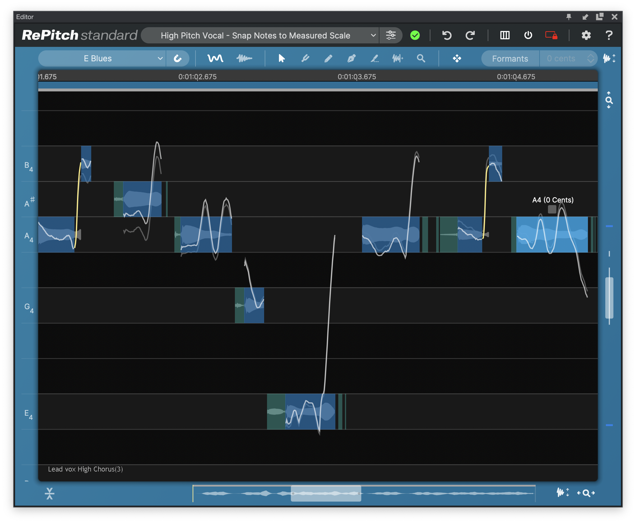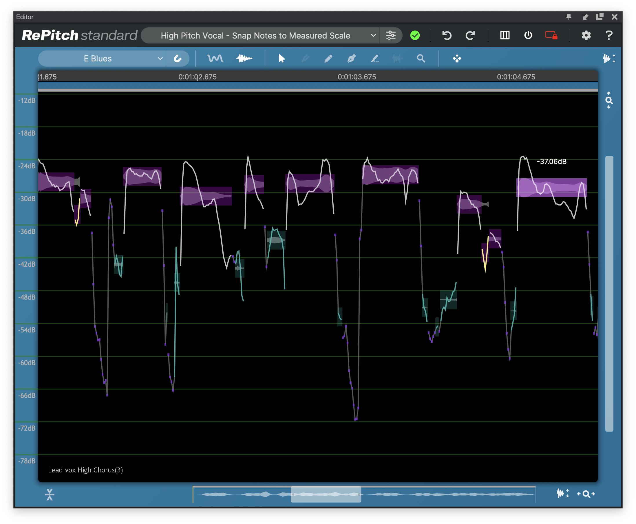 Essentially, in a second screen in RePitch's Main Window, the user is shown a trace of level measurements of the different elements of pitched signals, unpitched sounds and even noise floors. This trace is presented against a vertical axis of dBs and also contains the waveform. The segments of the traces can be moved up and down to control the level.