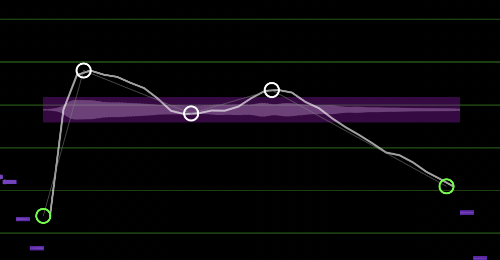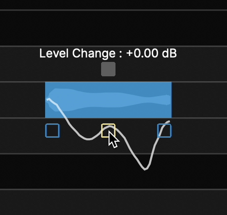 For quick changes to level, use the middle control point underneath the note block when in the Pitch screen. Control points are discussed in more detail in the Pitch Editing Tools section.