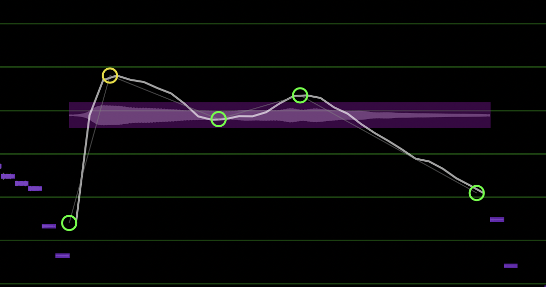 Lastly, small purple dots show where signals are pitched but the measured level is changing quickly.