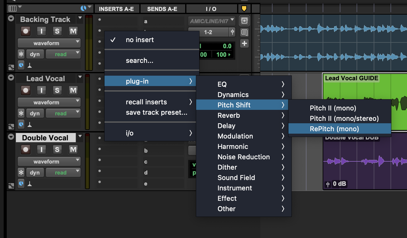 Clicking in the indicated empty insert slot will open the plugin menu, where we can select RePitch.