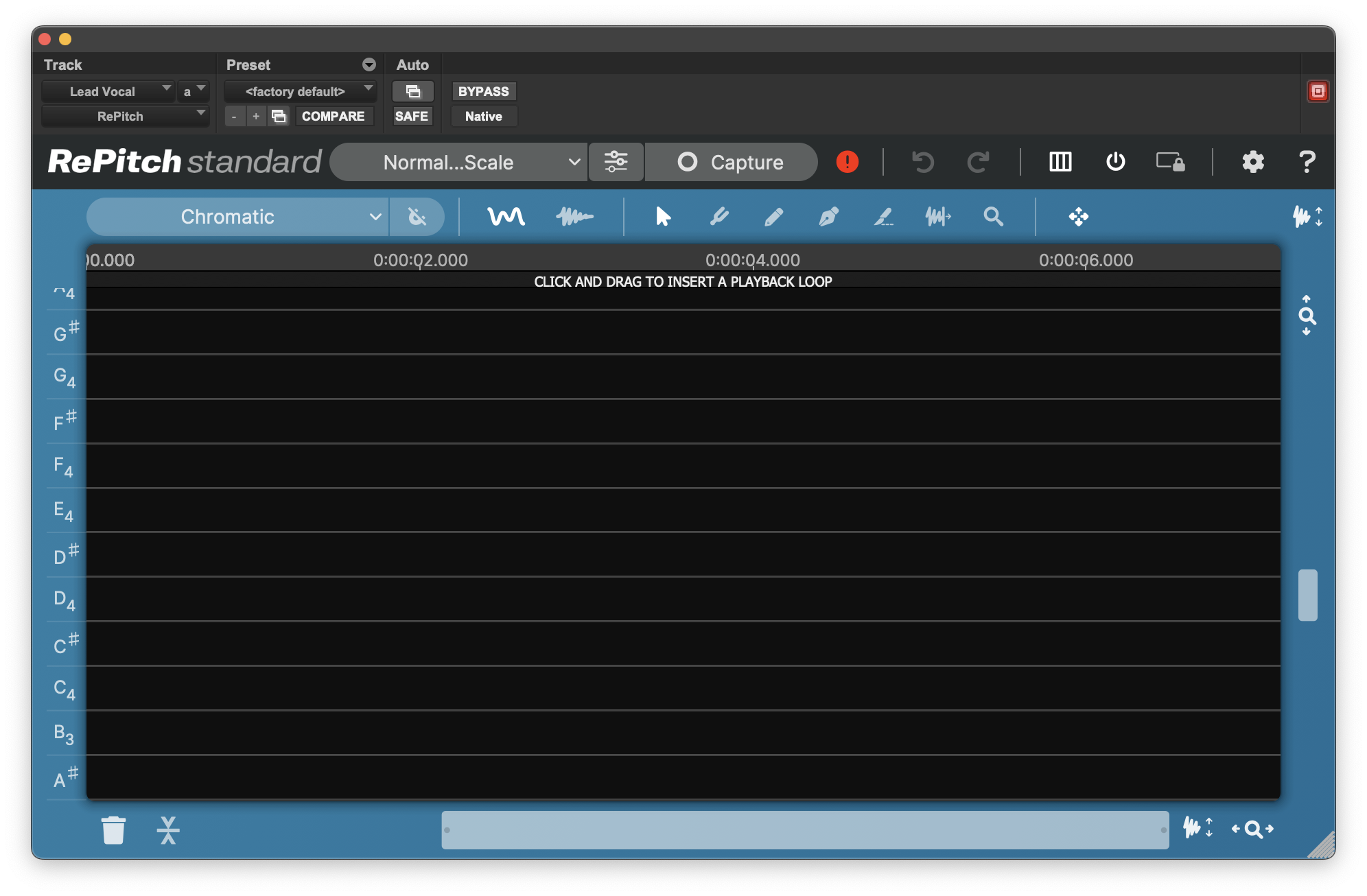 In the real-time versions of RePitch Elements, we need to Capture our audio before we can work with it. Before Capturing your audio, we suggest setting up a loop around the audio that you would like to capture. This will make it easier to capture the audio, and to listen back to the results after processing is applied.