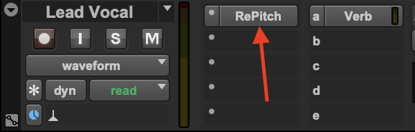 To access RePitch Elements in Pro Tools, we add it as an insert on the track that contains the audio we would like to work with. Here, we will add RePitch Elements to the Lead Vocal track. The empty insert slot is indicated by the red arrow.