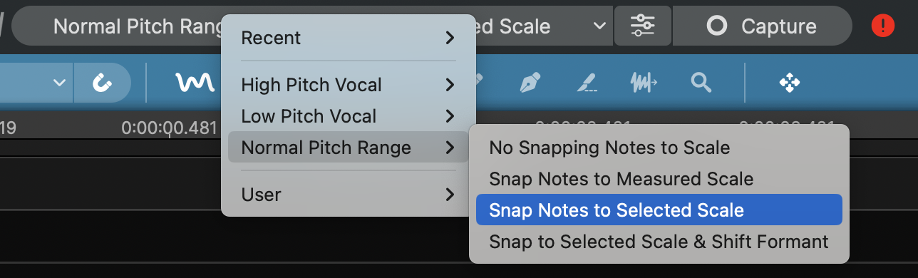 From the drop down, we'll select 'Normal Pitch Range > Snap Notes to Selected Scale'. This will tune our audio to the nearest chromatic pitch. If your audio is in a particularly low or high pitch range, select the corresponding sub-menu, and select the 'Snap Notes to Selected Scale' option.