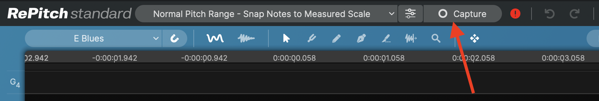 To begin the Capture process, we will first click the Capture button at the top of the user interface to arm RePitch Elements for recording. The Capture button is indicated in the below image by a red arrow.