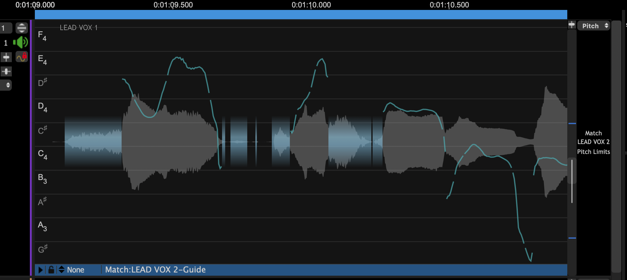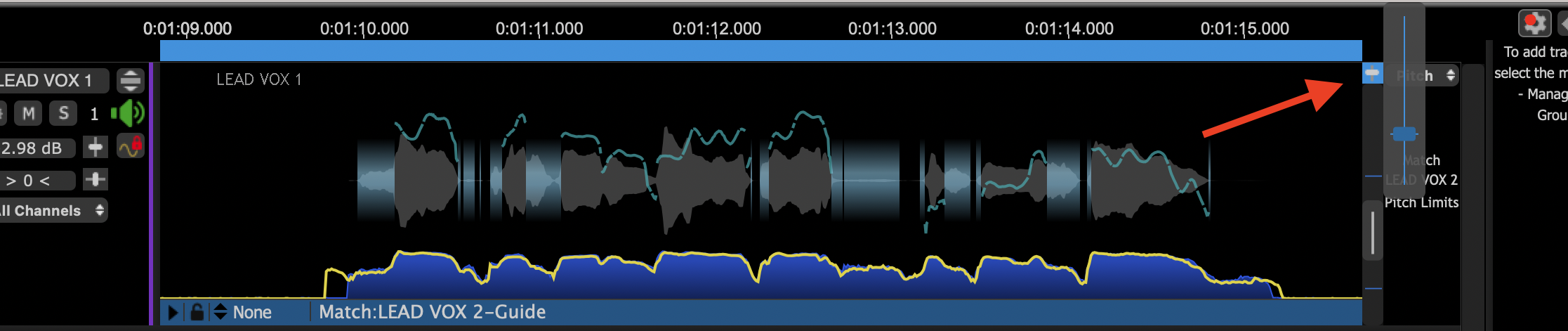 To scale the pitch trace(s) (i.e. display more or fewer pitch values) for example, to see more detail and have the note grid displayed, left click the Scale Display button (make sure the Selector is showing "Pitch") as shown below.