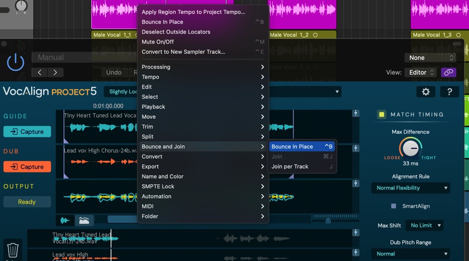 - To export the Output from VocAlign Project 5 AU to a track, select a Dub region in Logic Pro, then go to the File menu or right-click the region and select Bounce > Regions in Place… (key command: Ctrl+B). Adjust the various options presented in the Bounce dialog, as required – replace the region on the track or bounce to a new track, mute the original track, etc.