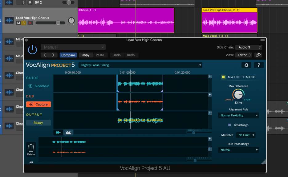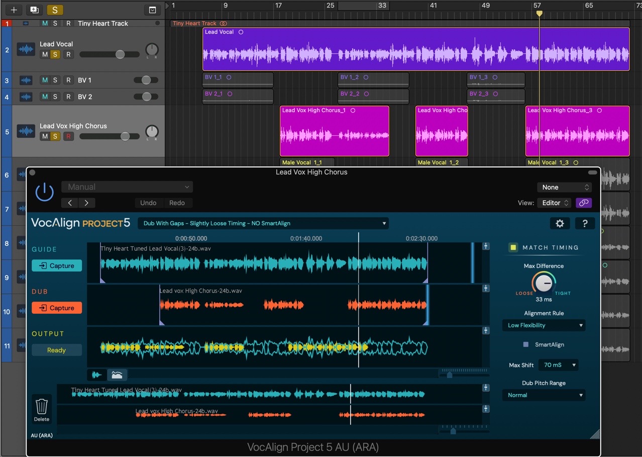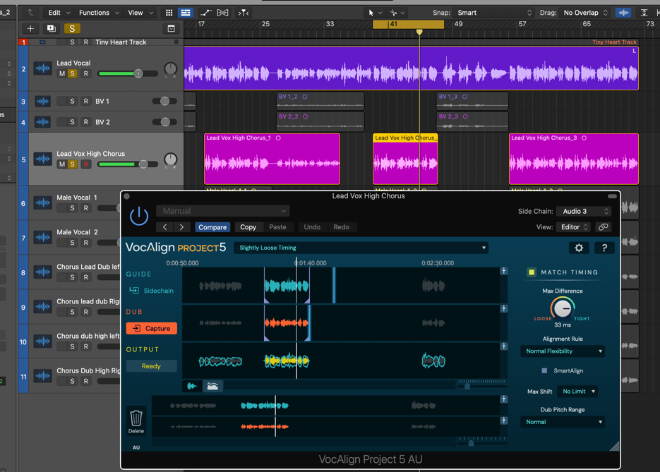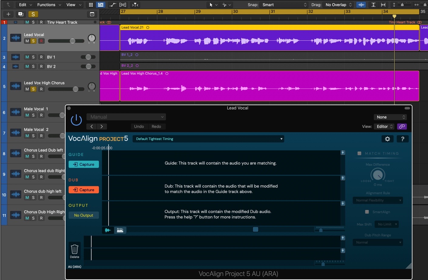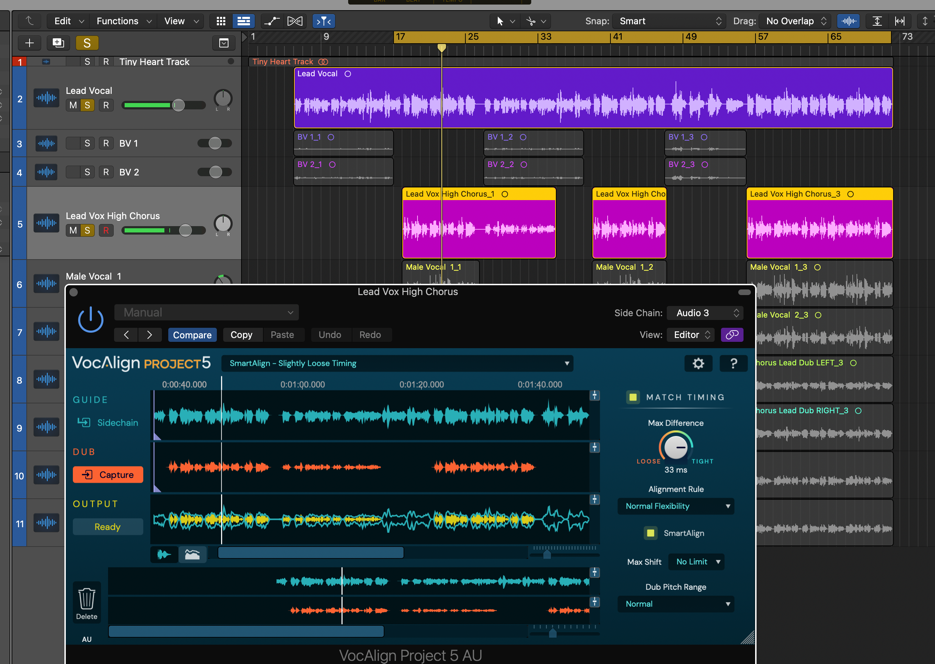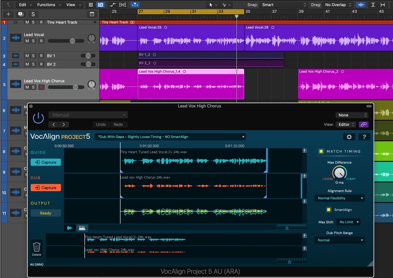 - For the curious, some explanation of what SmartAlign is actually doing will be in order. Thanks to SmartAlign, even though our three Dub regions and the Guide don't start and end at the same points on the timeline, VocAlign Project 5 has aligned everything correctly, based on the placement of the Dub regions, rather than the Guide. Turn SmartAlign off, and you'll see the yellow Output waveform jump to the wrong position, as the Guide is used to determine where alignment starts and ends instead – not good! Turn SmartAlign back on to reapply the correct alignment, then start playback in Logic to hear the perfectly aligned Lead Vox High Chorus Dub.