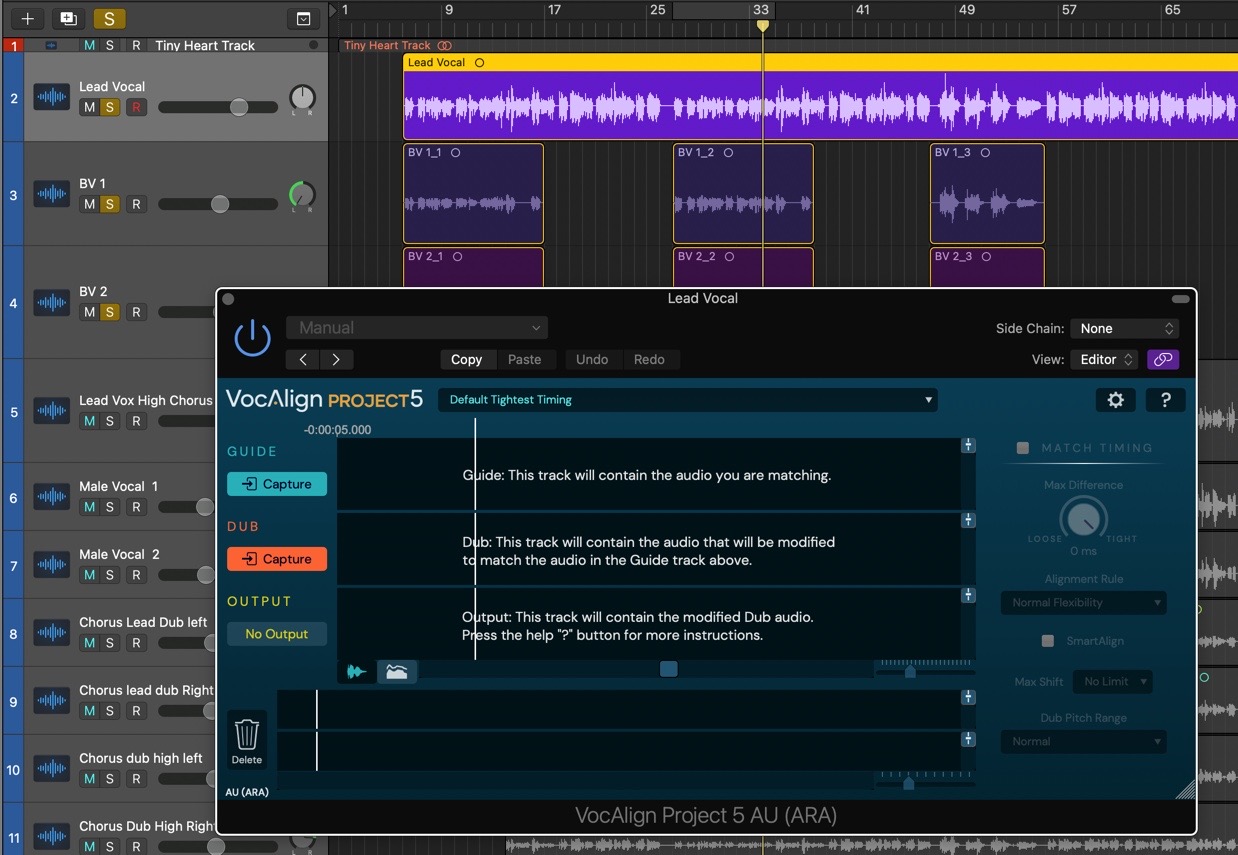 - With the ‘Tiny Heart’ project loaded in Logic, add VocAlign Project 5 AU as an Insert effect on the Lead Vox High Chorus Track by selecting Audio FX > Audio Units > Synchro Arts > VocAlign Project 5. This will be our Dub, to be aligned with the Guide.