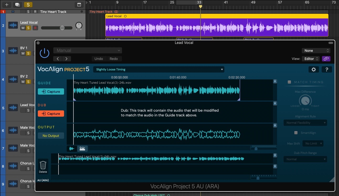 - For the curious, some explanation of what SmartAlign is actually doing will be in order. Thanks to SmartAlign, even though our Dubs and Guide don't start and end at the same points on the timeline, VocAlign Project 5 has aligned them correctly, based on the placement of the Dub regions, rather than the Guide. Turn SmartAlign off, and you'll see the yellow Output waveform jump to the wrong position, as the Guide is used to determine where alignment starts and ends instead – not good! Turn SmartAlign back on to reapply the correct alignment, then start playback in Logic to hear the perfectly aligned BV1 and BV2 Dubs.