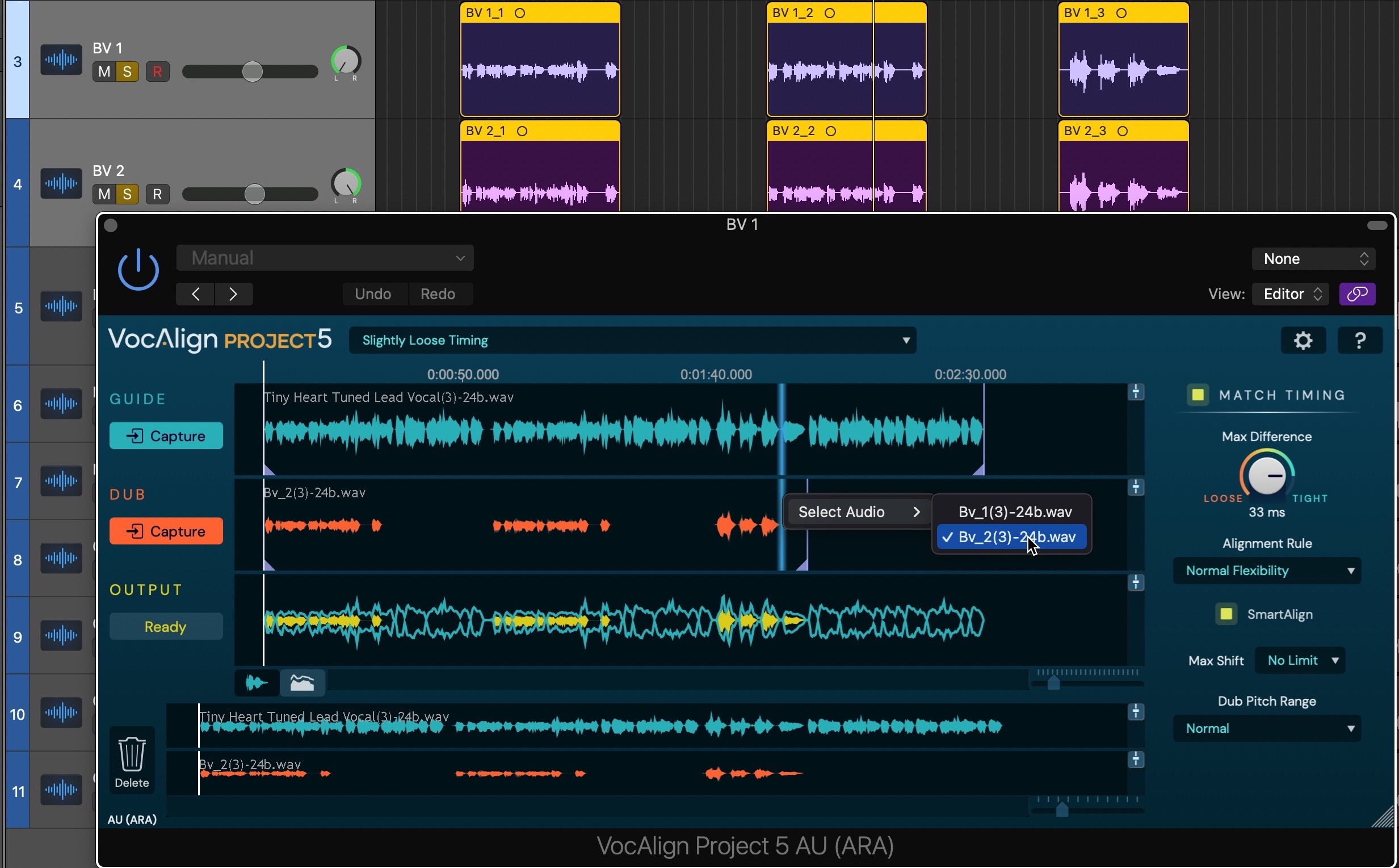- The BV1 and BV2 tracks each contain three regions, and whichever regions are selected when you click the Dub Capture button will be captured for alignment. Select all six BV1 and BV2 regions and click the Dub Capture button. Both Dubs are captured and 'stacked' within VocAlign Project 5, appearing as orange waveforms. You can switch between them within the plugin, should you wish to change their processing parameters independently, by right-clicking in the Dub display and selecting from the Select Audio submenu.