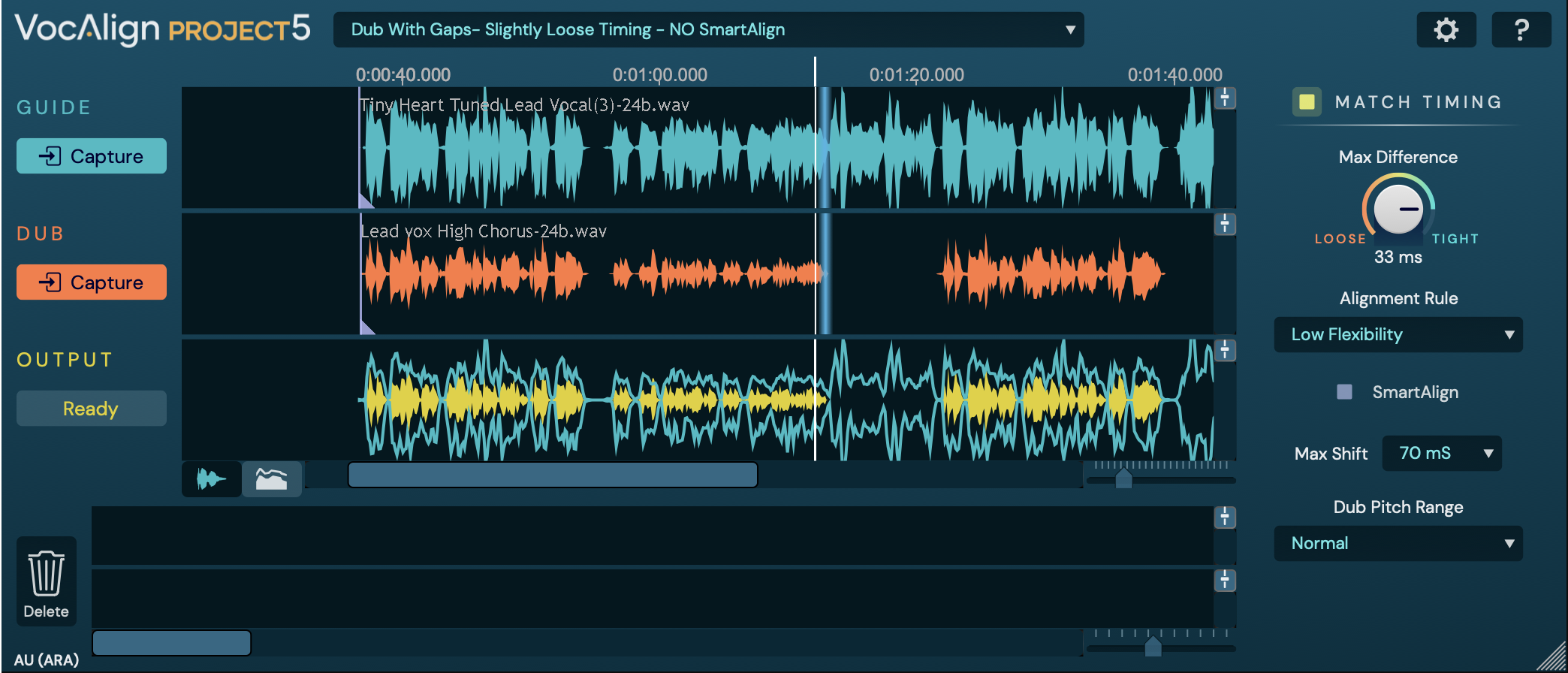 Sweep the Max Difference control in the Match Timing section around between Tight (0ms) and Loose (200ms) and you'll hear and see (in the Output display) the Dub align more (towards Tight) or less (towards Loose) rigidly with the Guide.