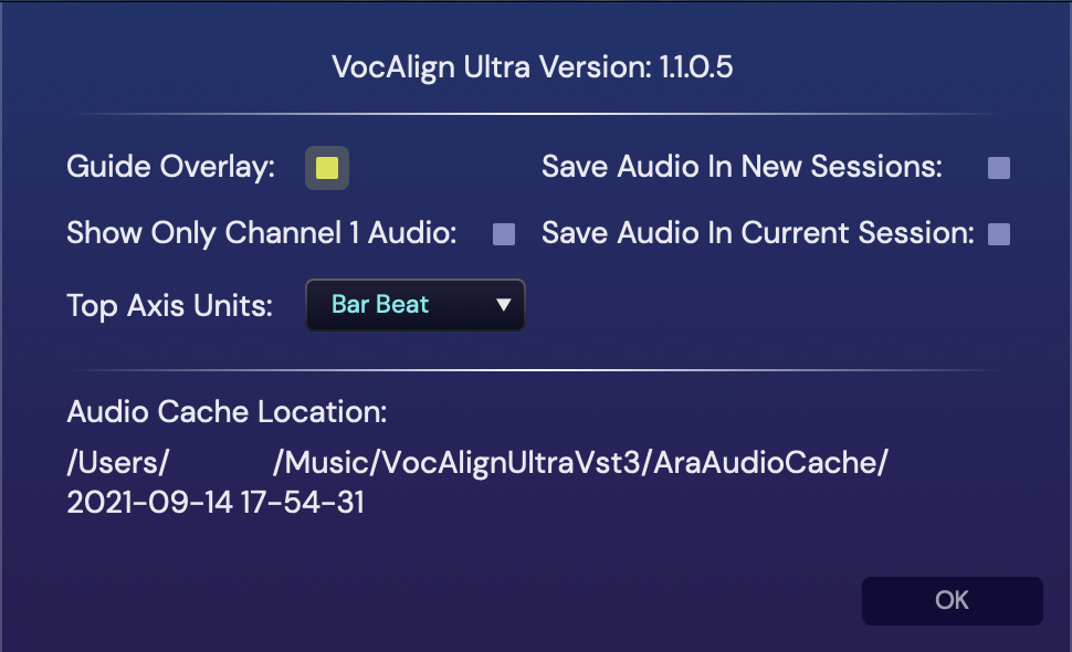 Another clue is in VocAlign Ultra’s “Settings” dialogue box (shown below in Fig.4) which displays the Audio Cache Location path for the local directory that the plug-in is using to store its audio for the current session. This may also help you determine which subdirectories are still in use.