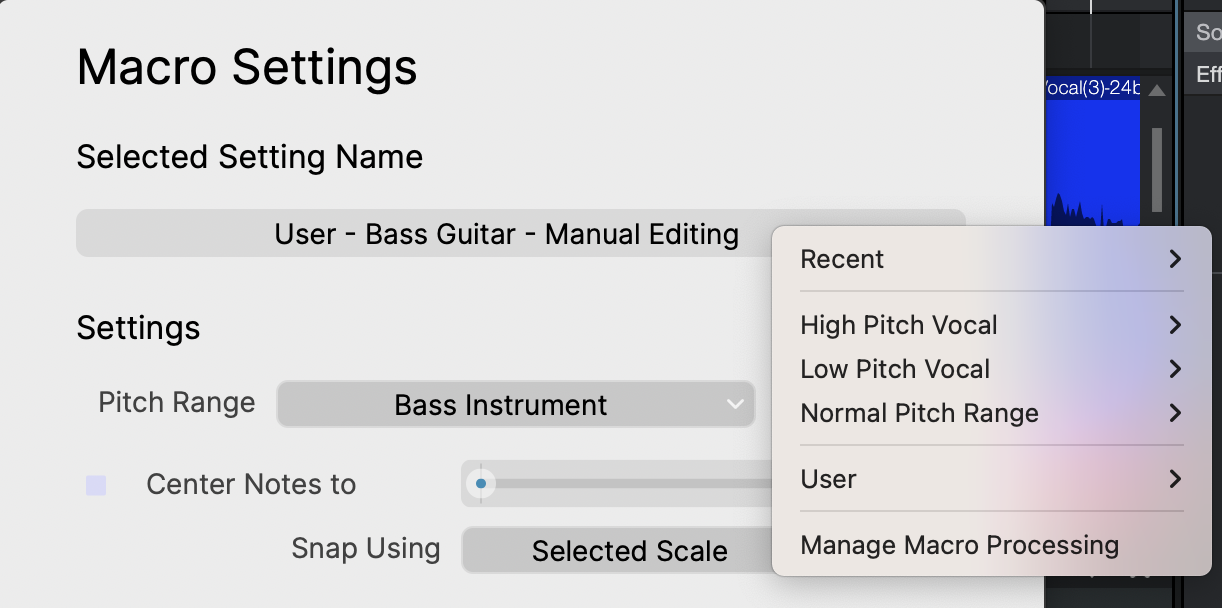 and then clicking in the Macro Setting Name which in this example shown below is "User - Bass Guitar - Manual Editing"