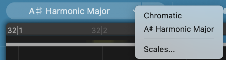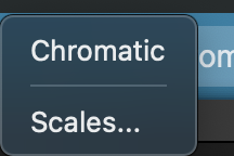 Lists of Scales and the Scale control panel are accessed by clicking on the drop-down control button shown below, which will show the name of the currently-selected scale (e.g. Chromatic is the default scale and is shown in this example).