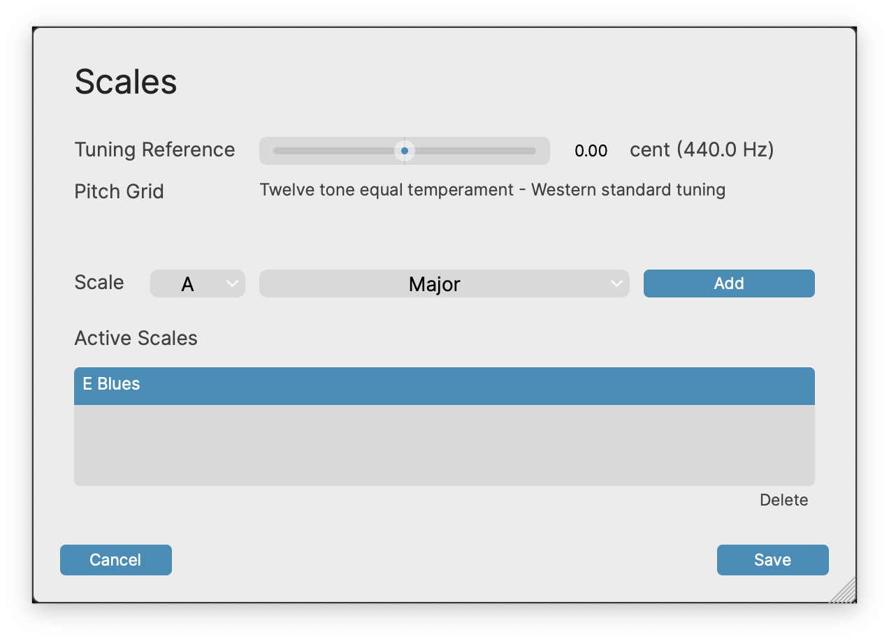 Its main purpose is to let you add and delete scales in the Active Scales list, and also select the scale whose name and notes will be displayed in the Main Window and will provide the note frequencies that automatic tuning (snapping) will use as targets for the detected notes to be moved towards.