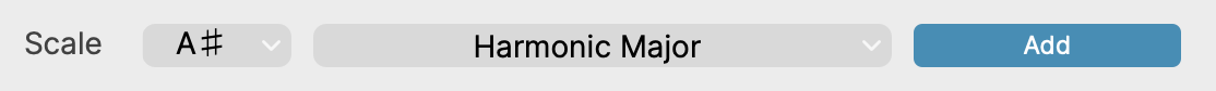 After completing the Save in the example above, the saved scale wlll be shown as the Selected Scale (A# Harmonic Major) in this example.
