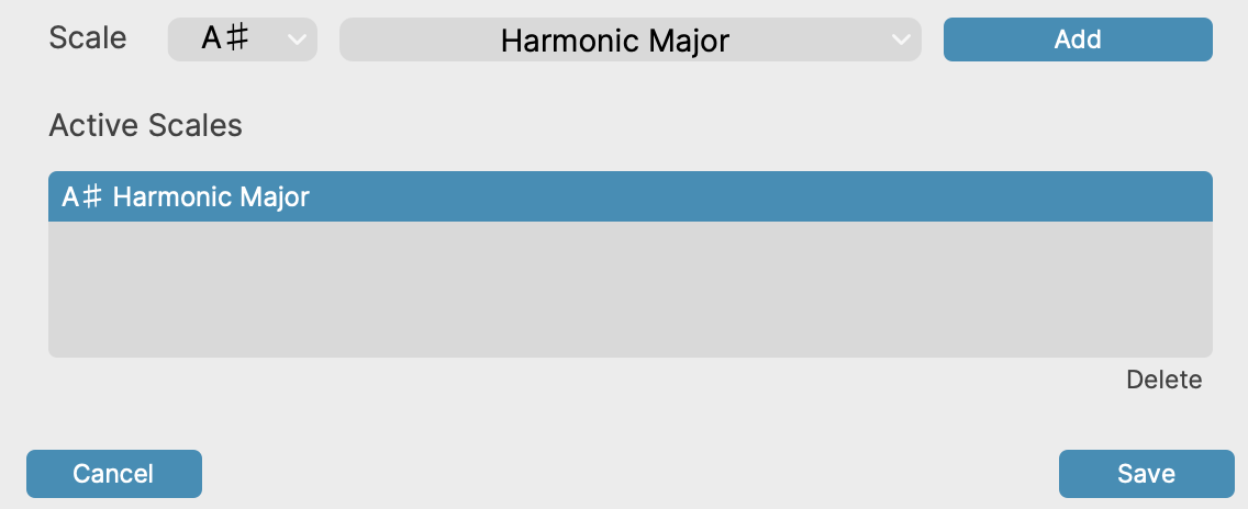 - Other Scales can be added to the Active Scale list by selecting the drop down button in the Scale Display, choosing the desired Key and Type of Scale and then pressing Add to include it in the Active Scales list.
