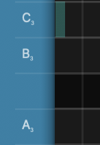 The left side of the screen (shown below) displays the Selected Scale's Note Names next to their “note lanes” which transverse the main screen horizontally.