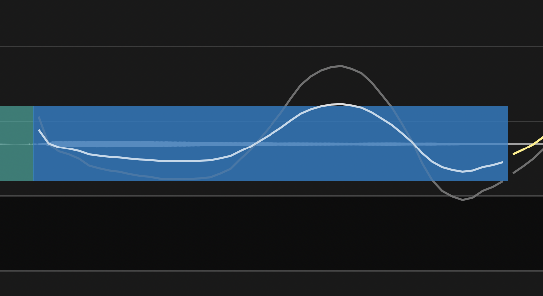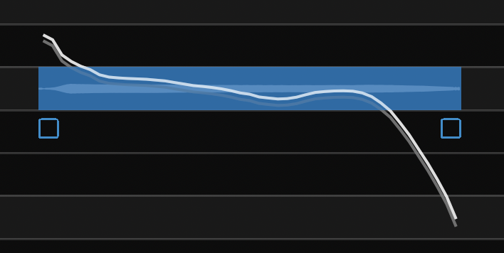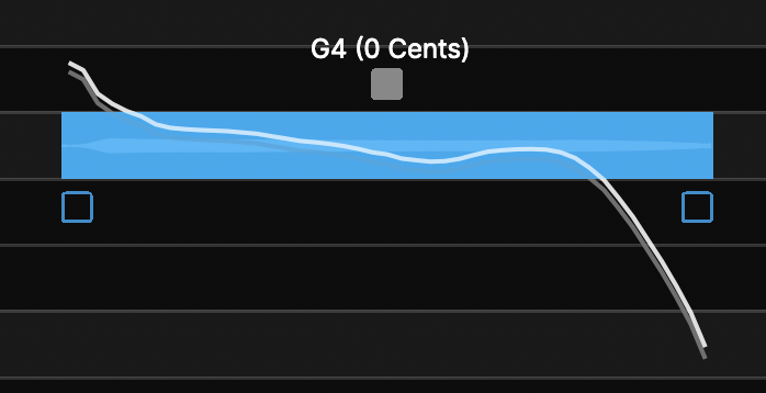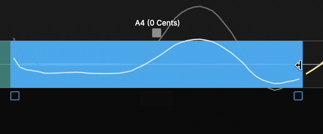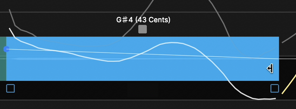 In the picture below, the Modulation control point has been dragged downward, and has reduced the note's modulation range as can be seen by comparing the resulting pitch in white with the original pitch trace in gray (the less visible curve within the blue note box).