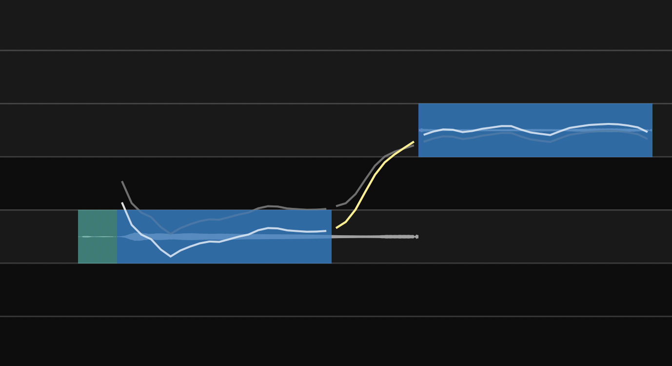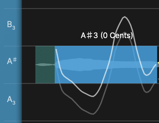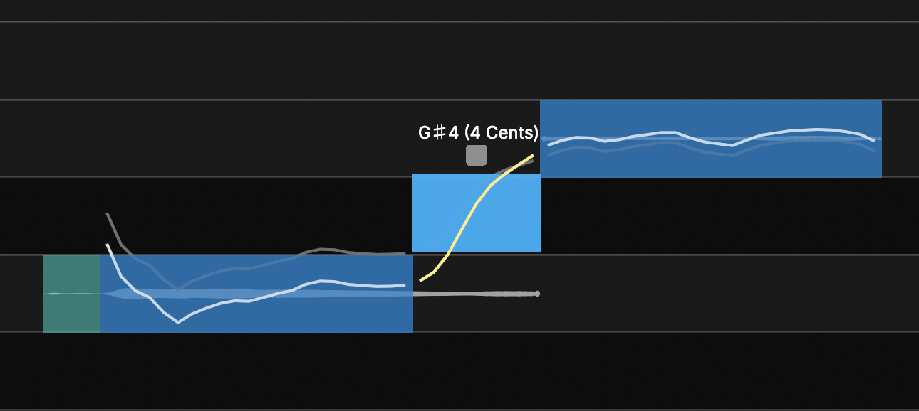 , the scale's note lanes across the screen will be displayed in a lighter grey than the the black non-scale note lanes, as shown below. In this picture, the signal's pitch traces in white and orange have been measured and separated into predicted defined notes that are indicated by blue semitone-high blocks containing the white pitch trace sections. After automatic tuning, these note blocks are centered on the frequency that the RePitch predictor expects will be heard.