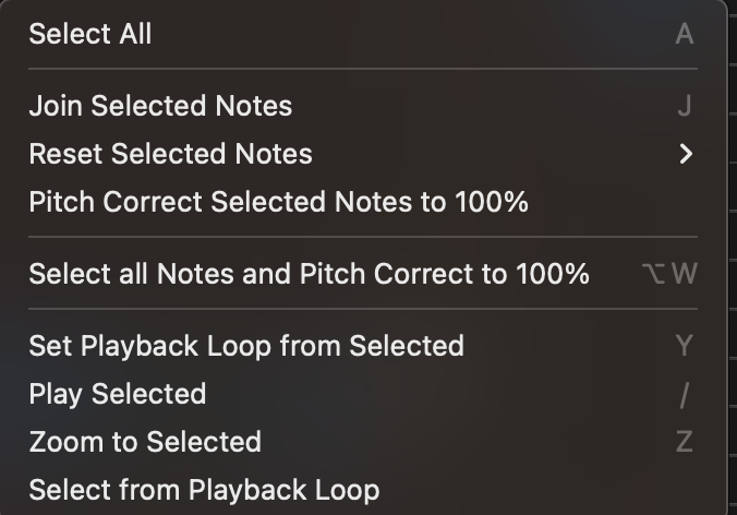 - Use the Right Click menu to choose Select All Notes and Pitch Correct to 100%