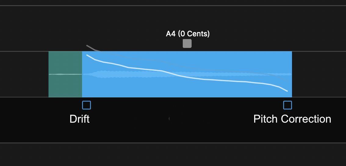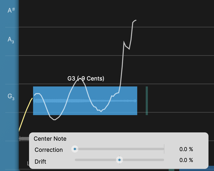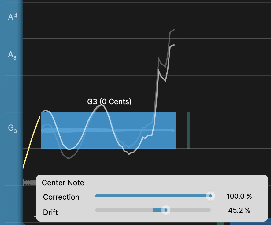 A Drift control is inside the Center Note Tool menu as described above. Click here to go to the instructions. The Drift control point will quickly change this parameter. Click and drag vertically to increase or decrease the pitch drift. |