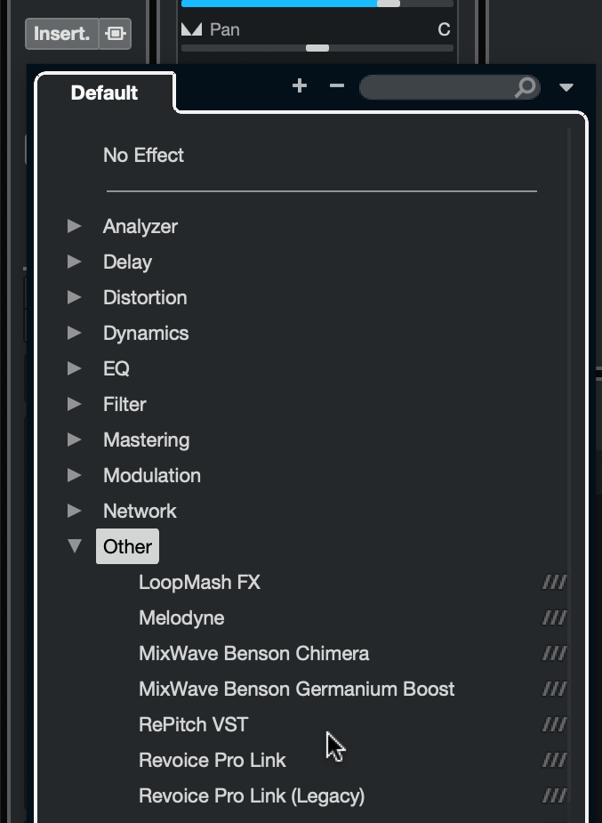 | Cubase/Nuendo | To add RePitch as an insert, select the track and click the small drop down menu under Insert in the Channel panel on the left side of the user interface. In the below image, it is indicated by the red arrow. ![]() This will open the below menu, where you can select 'Other -> RePitch VST' to add RePitch to the track as an insert. |