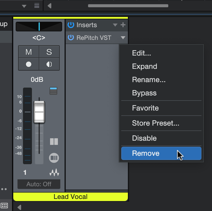 | Studio One | Click the small downward pointing arrow on the right side of the RePitch VST insert and select 'Remove' from the dropdown menu.