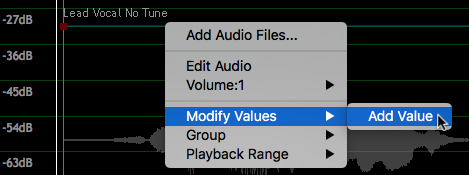 You can add control points where the value will change by left clicking at any point along the line. Alternatively, points can be added by right clicking anywhere in the audio track concerned and selecting Modify Values > Add Value from the contextual menu, as shown below.