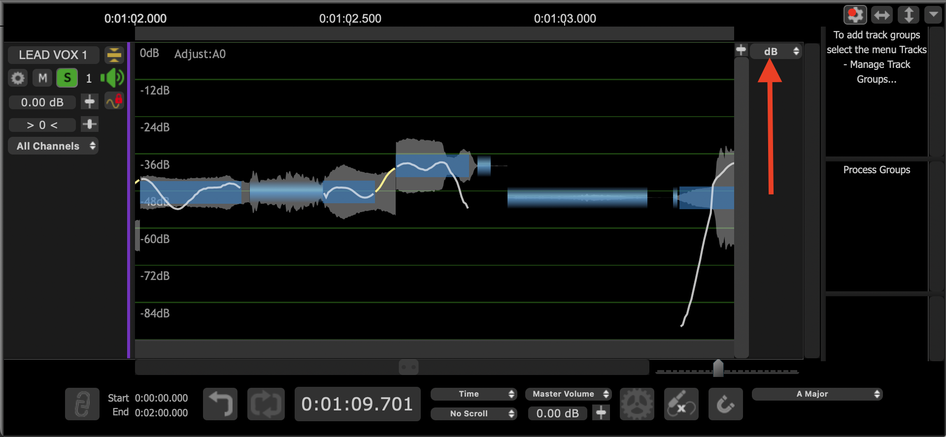 Select dB on the track display selection on the right of screen. You can move the scale up and down with the vertical slider and expand the range of display with the “pop up” control next to the display selector showing “dB”.