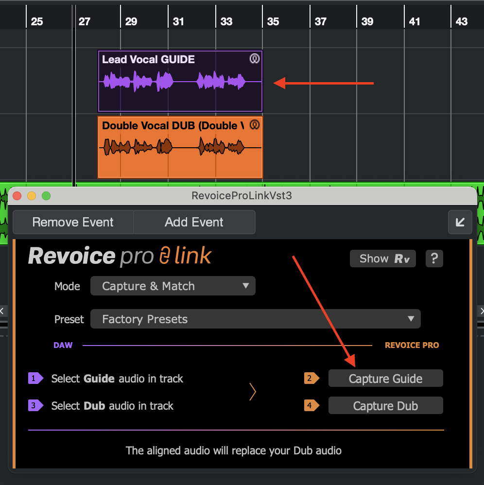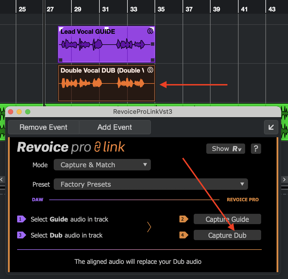 Repeat the same process but select the Double Vocal DUB region in your DAW, and click Capture Dub, just below Capture Guide.