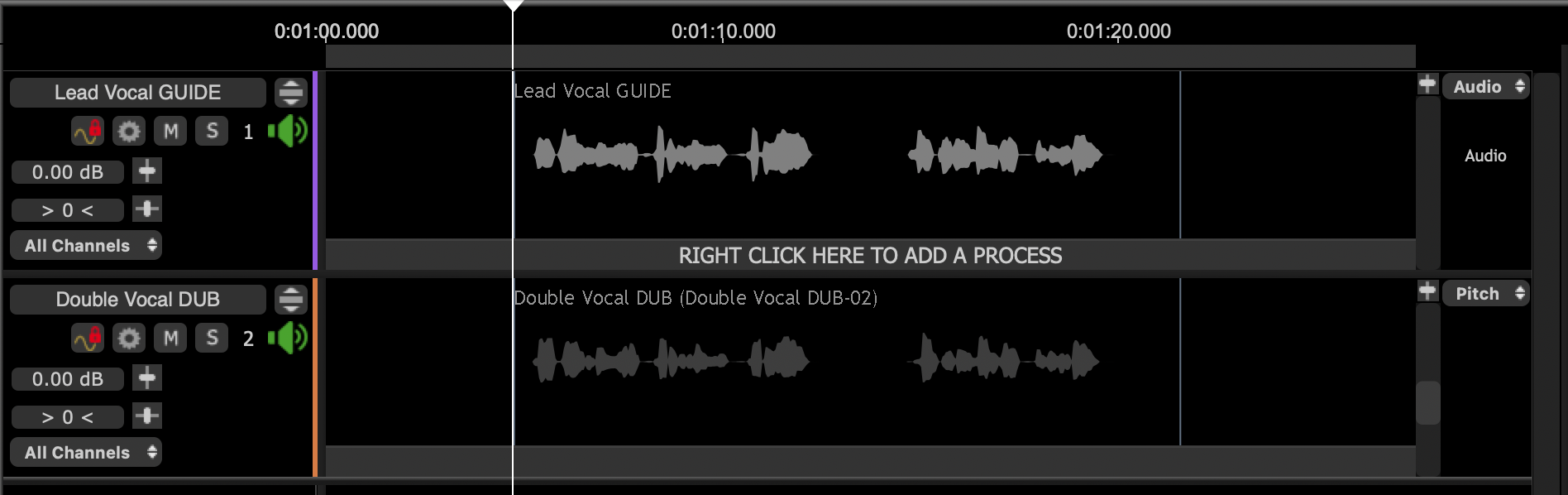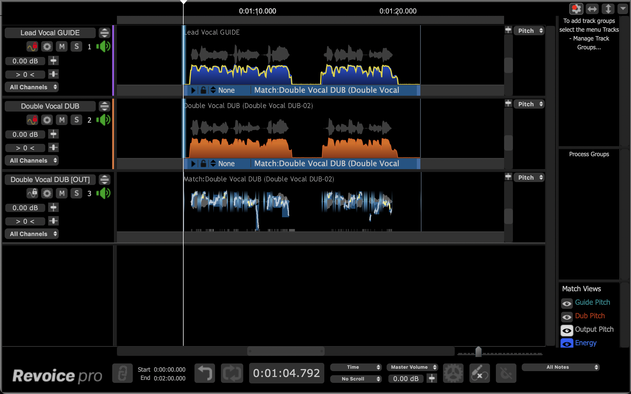 In this example we are going to use a Match (see Match Process for more details) to align the Dub signal (Double Vocal DUB) to the Guide signal (Lead Vocal GUIDE).