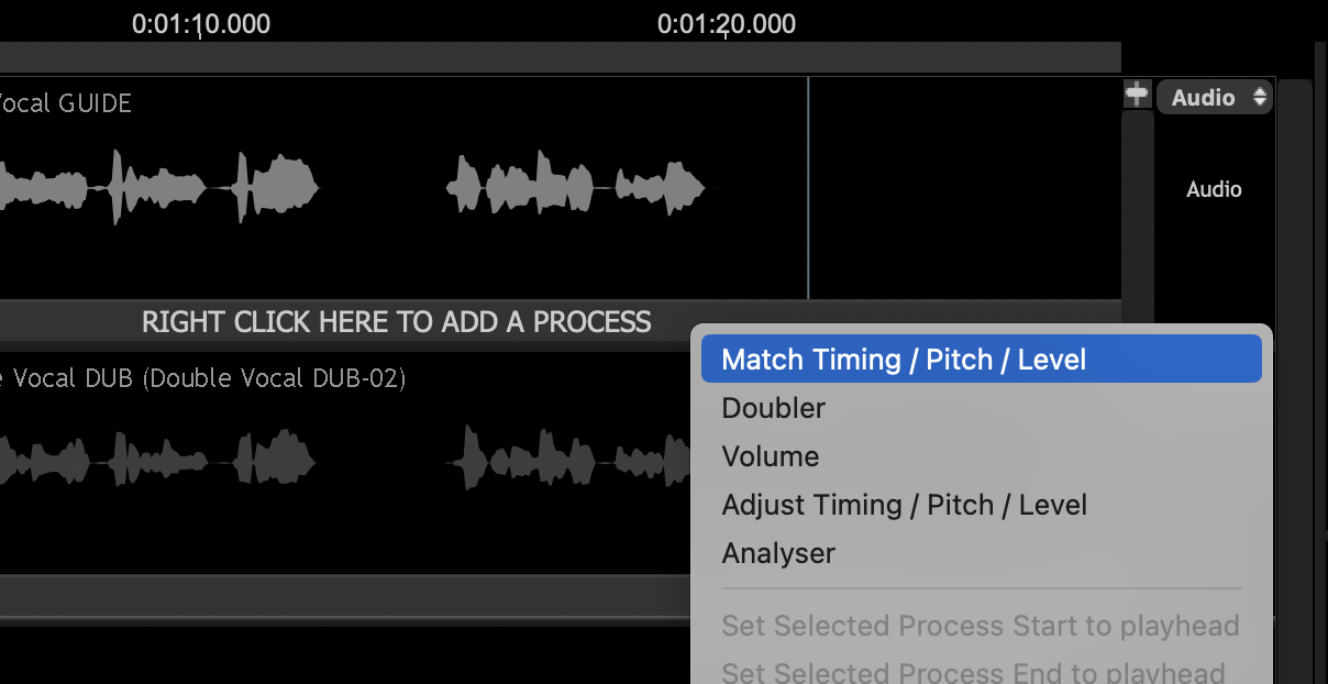 Next, right click in the Process Control track and select Match Timing / Pitch / Level. This will open the New Process Window.