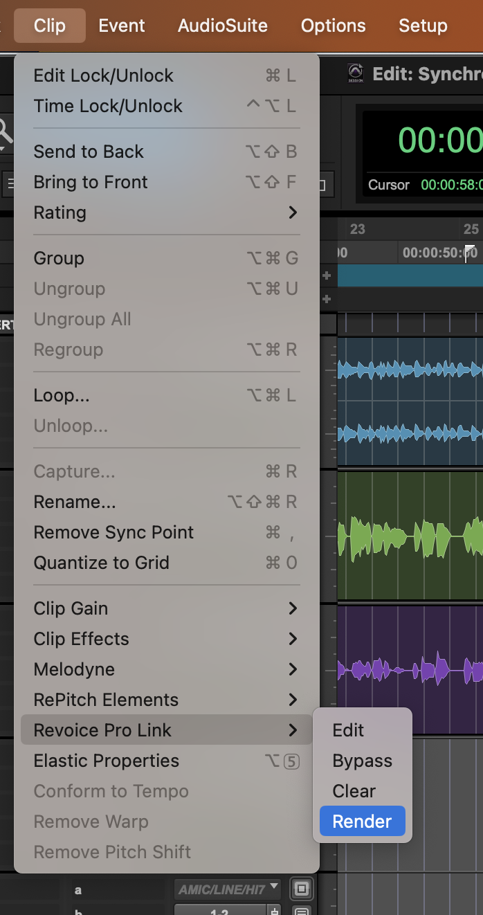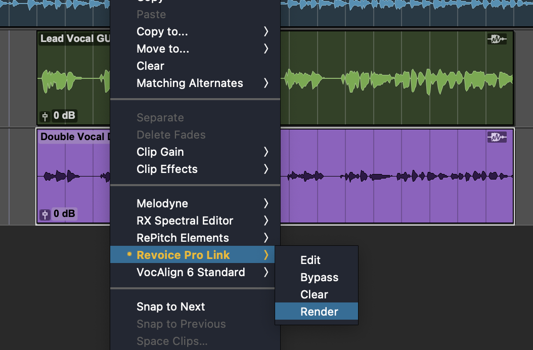 If you need to create a permanent version of the aligned signals, select the Render option in either the Clip right-click menu, or in the Clip file menu under Revoice Pro Link -> Render.