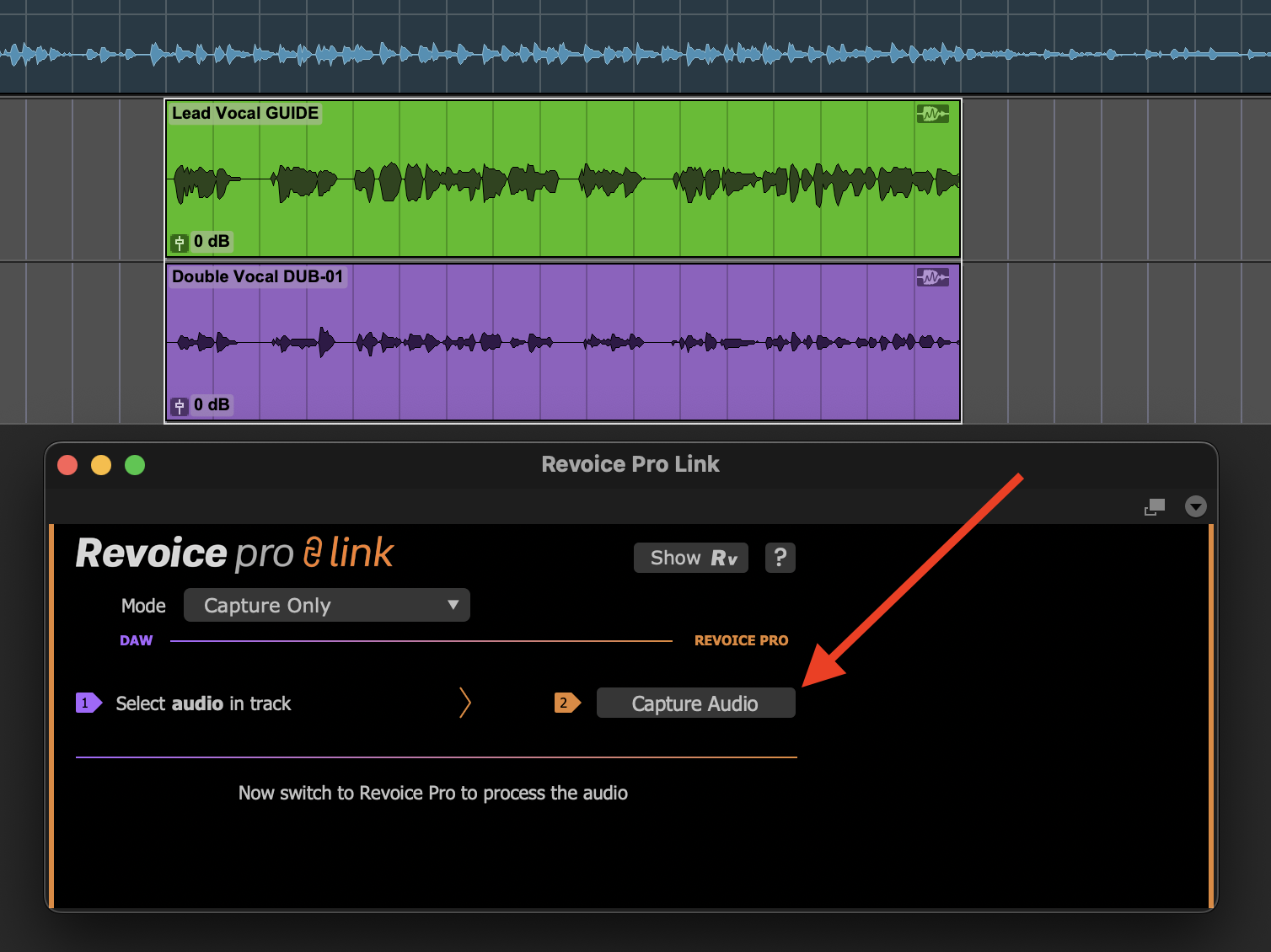First, select the audio clips that you would like to import into Revoice Pro. In this case, we will import our two clips from the Lead Vocal track and the Double Vocal track. Once you have selected the regions, click Capture Audio in the plugin window as indicated in the below image. Remember, both clips or tracks must have Revoice instantiated as in the previous section.