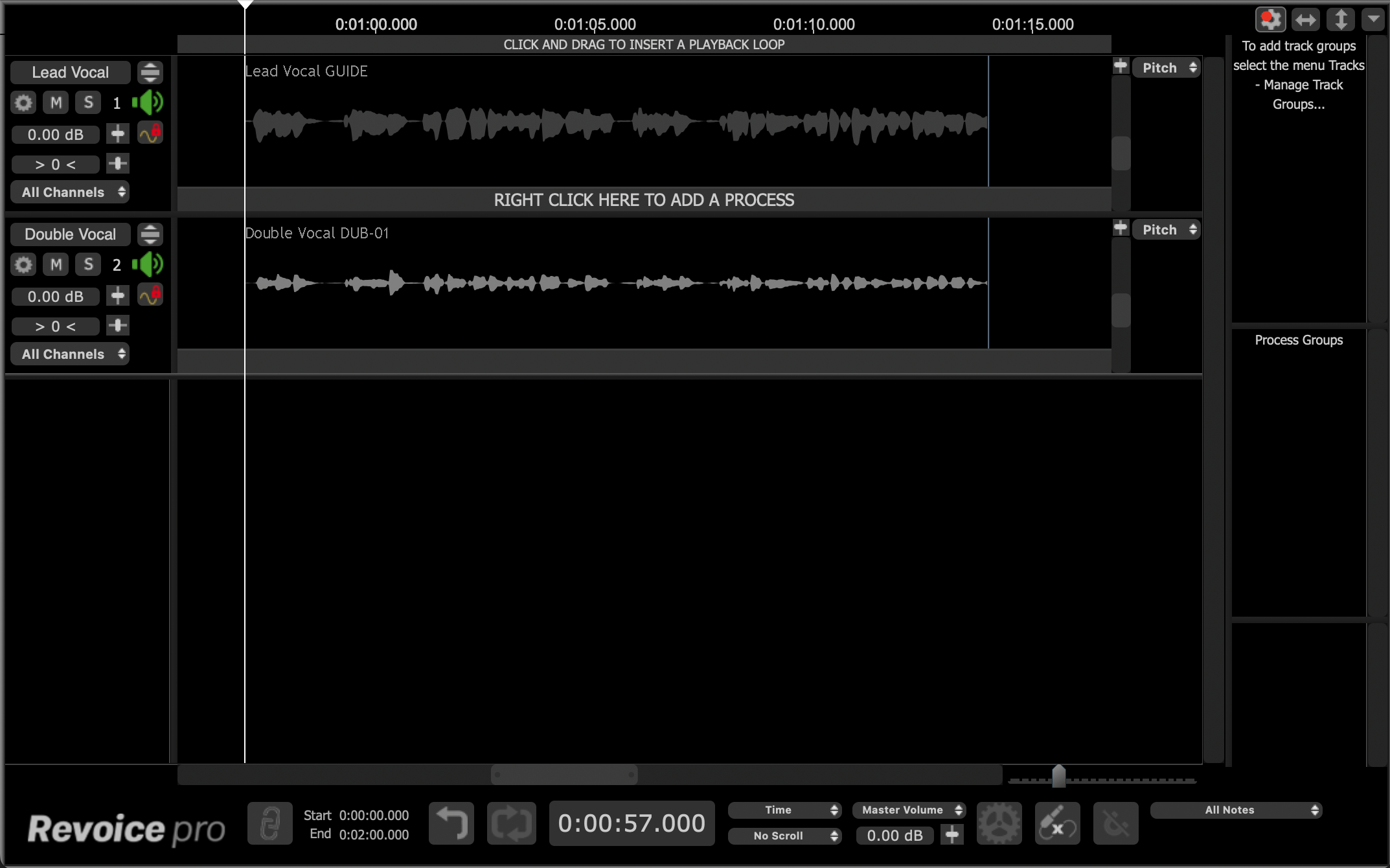 If you open your Revoice Pro project window, or click the Show Rv button in the top right of the plugin window, you should see something similar to the below. Revoice has created two new tracks, one called Lead Vocal and the other called Double Vocal. The tracks are ready to be processed further within Revoice.