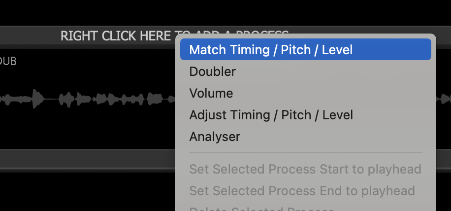 Next, right click in the Process Control track and select Match Timing / Pitch / Level. This will open the New Process Window.