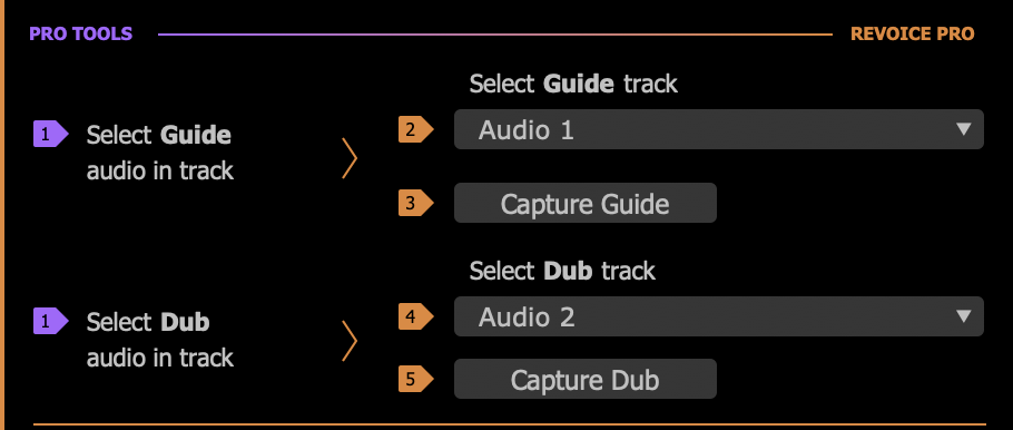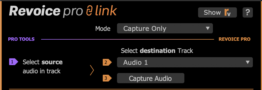 Click Capture Guide in the plug-in window (the orange 3 arrow shown above). This will send the selected audio to the Revoice Pro (RVP) Session.