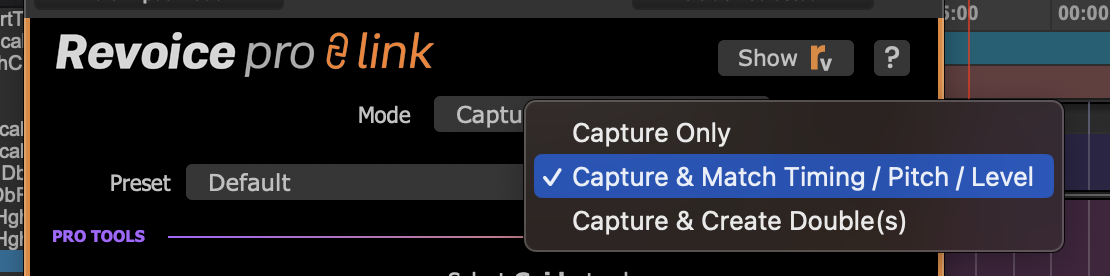 From Revoice Pro 4.3, the Pro Tools Link plug-in has a number of capture modes to choose from, in a drop-down menu labelled Mode. The controls lower down the plug-in control window will change depending on the mode selected.