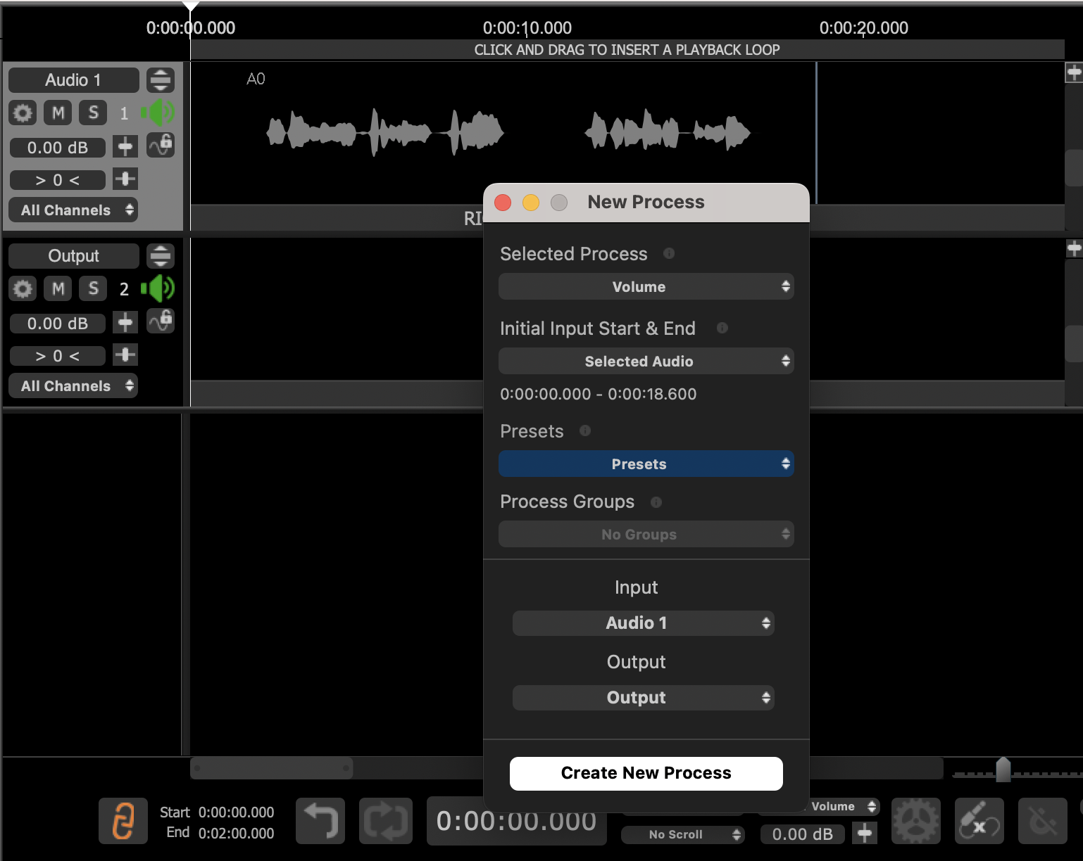 Note that in the Revoice Pro Session shown, the second track has already been labelled Output, (which will be the destination for the Volume Process output); the track containing the Input audio is labelled Audio 1. In the picture, the input audio is shown as "selected" (in light grey), which is how it would be immediately after loading it. The New Process window is shown open at the right.