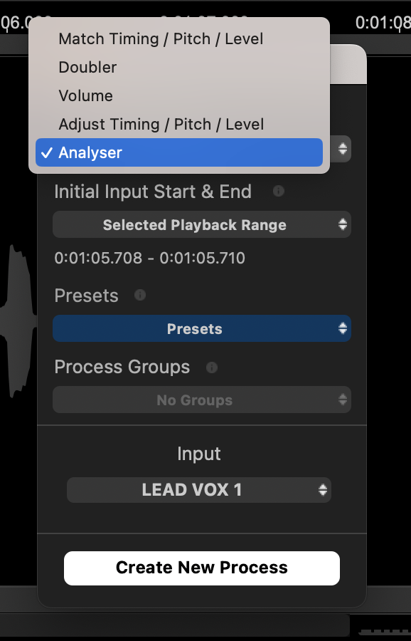 Make sure the input audio channel is the one you want to analyse, then press the New Process button at the bottom of the New Process window, or N on the keyboard.
