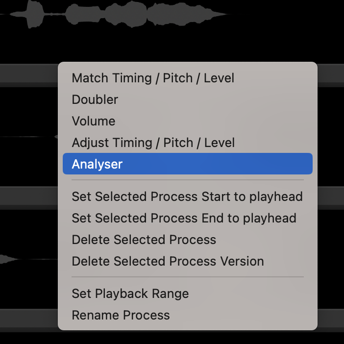 Press B to open the New Process window (unless it is already open) and select Analyser in the Selected Process drop down at the top, or right click on a track's Process Control bar below the track, and select New Analyser.