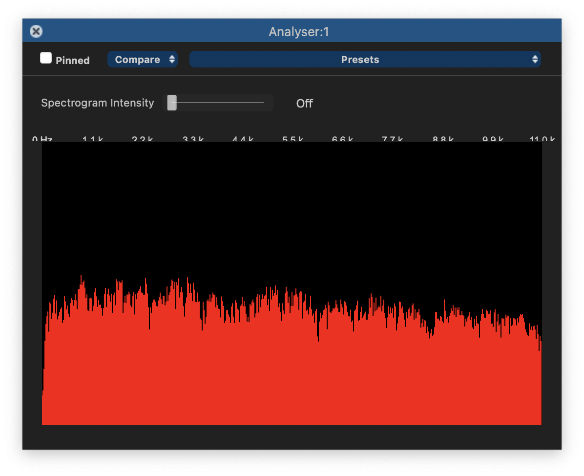 The Analyser control panel will appear showing a red graph of the sound level (vertical axis) at different frequencies (horizontal axis).