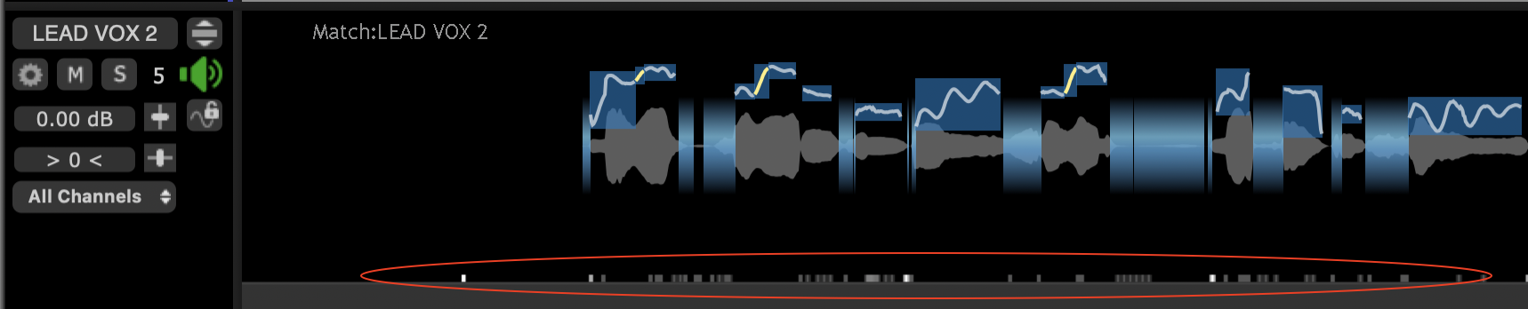 In the Match and Adjust processes, Revoice Pro tries to do as little processing as possible. When it does process a signal, it displays an indication of the relative amount of processing that has been applied along the audio waveform. This will help you focus your attention when you listen for the changes.