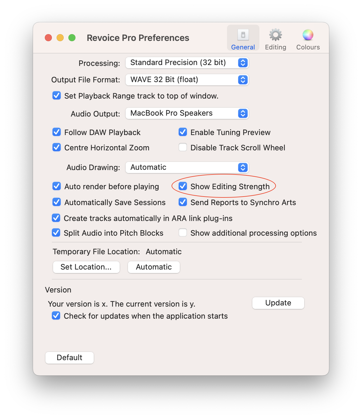 You can turn this display on and off in the Revoice Pro Preferences window using Show Editing Strength as in the picture below.