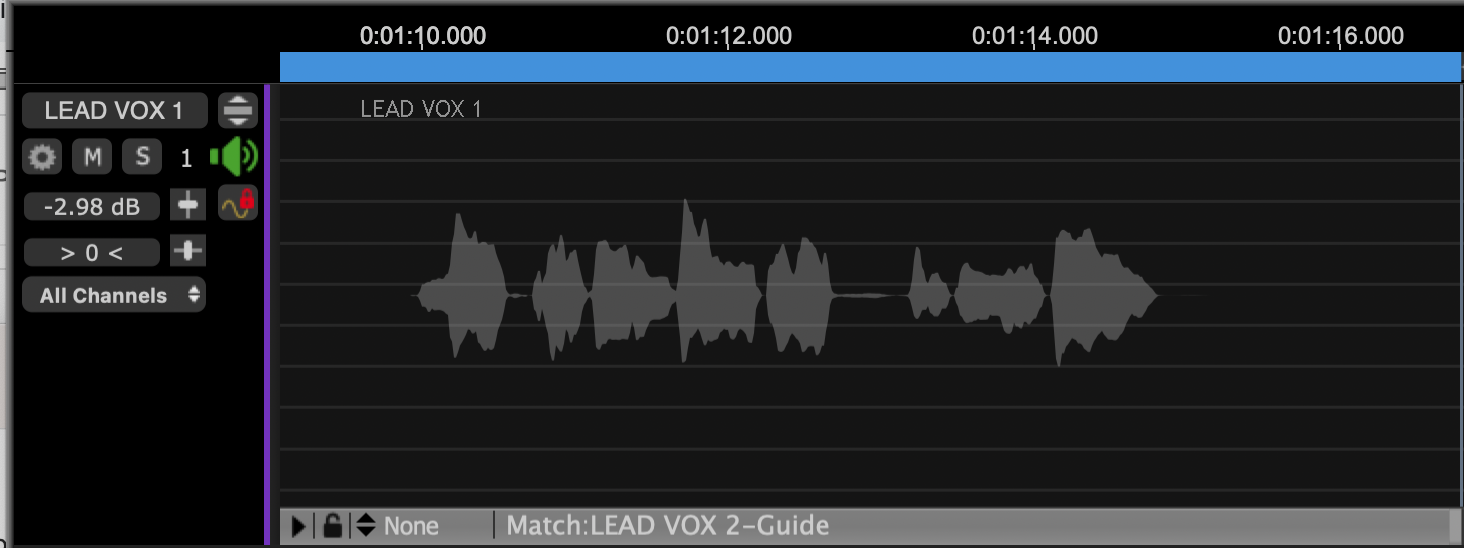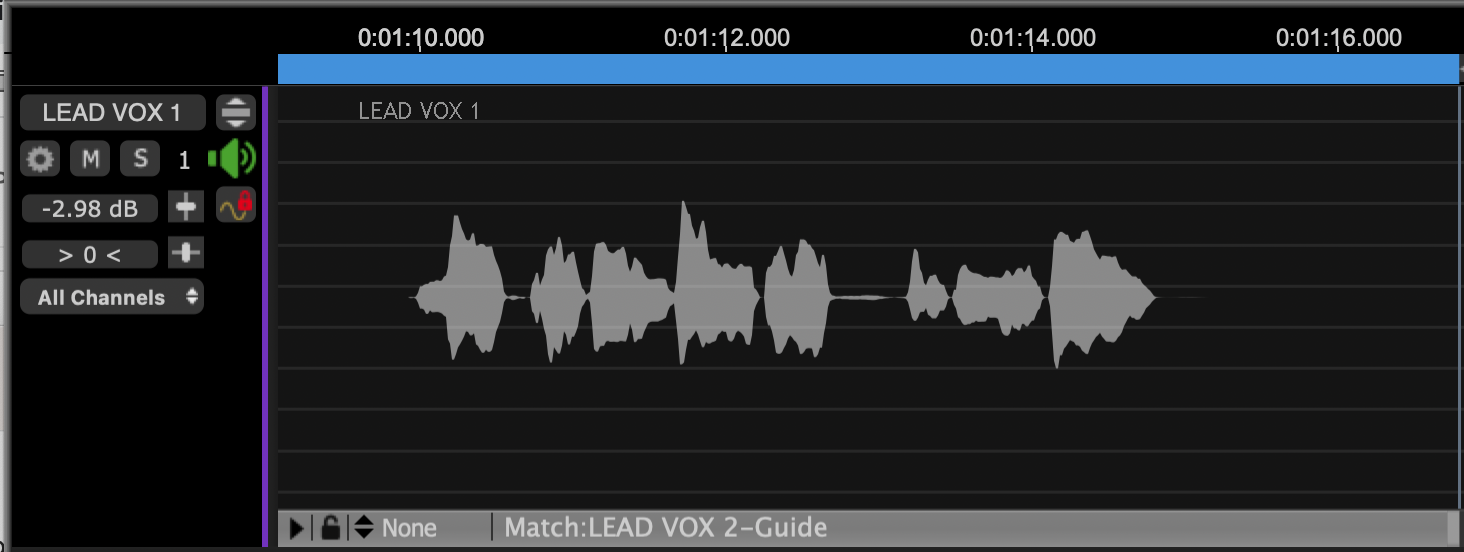 In many cases, a waveform is selected for editing by just left clicking it once, and it will be displayed in light grey indicating it is selected. The image on the left below shows an unselected audio waveform, and the image on the right shows a selected audio waveform. In both cases, the Match Process in their Process tracks at the bottom of the image is greyed out to show that it is not selected.