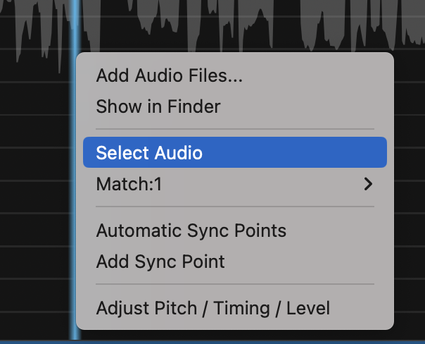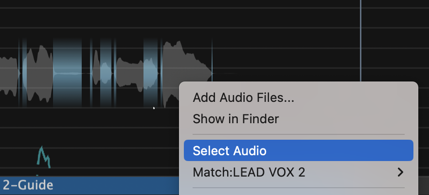 - Right click in a waveform area and select the 'Select Audio' menu item as shown below in blue.
