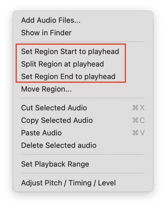 If you do not see these menu items, it may be because you have an active and selected Process on this audio region. In order to Select the audio region and see these options, right click the region and select the 'Select Audio' menu item as shown below.