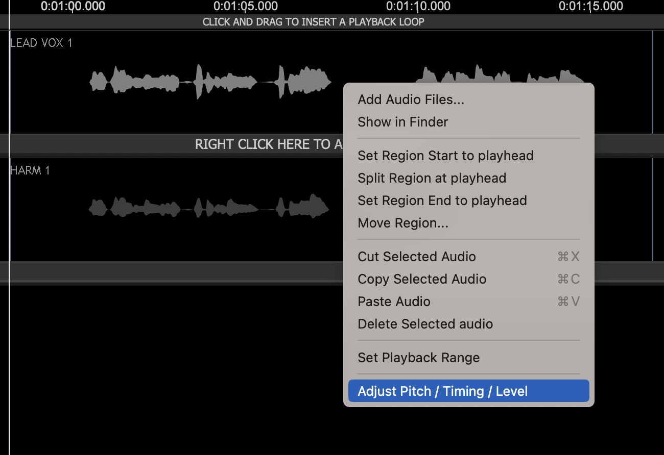 By right-clicking the audio region for Lead Vox 1, we can open the context menu and select 'Adjust Time / Pitch / Level'.